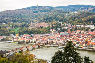 從小徑走下去是海德堡一條老橋Carl Theodor Old Bridge,這個方向也可以望到城堡。穿過橋就是市中心;遊客挺多的。不過在下山前,還請好好欣賞Heidelberg的全景呢。